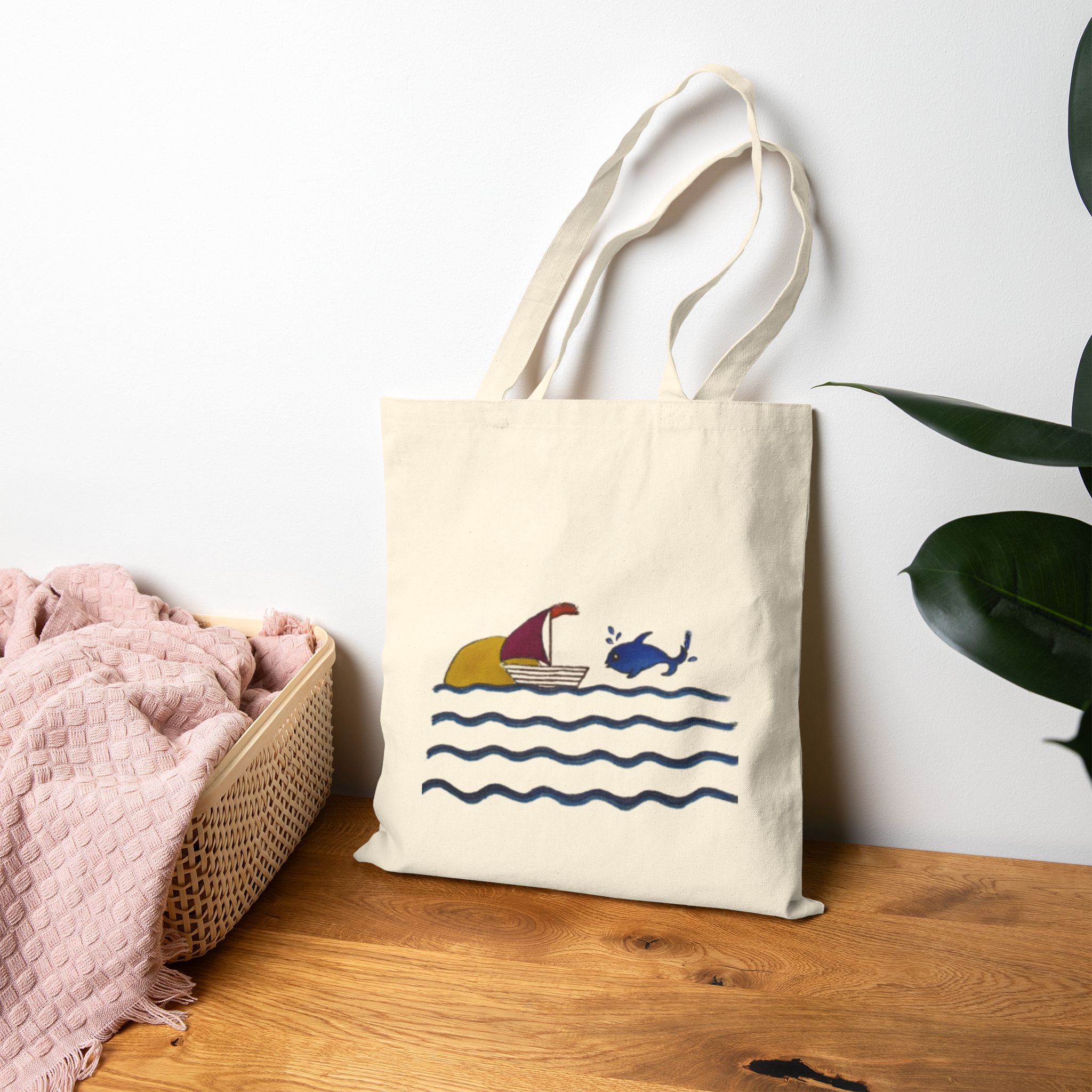 Dreamy hand-painted tote featuring a boat, dolphin, and rainbow. Adds a cheerful touch to your style while being eco-sustainable.