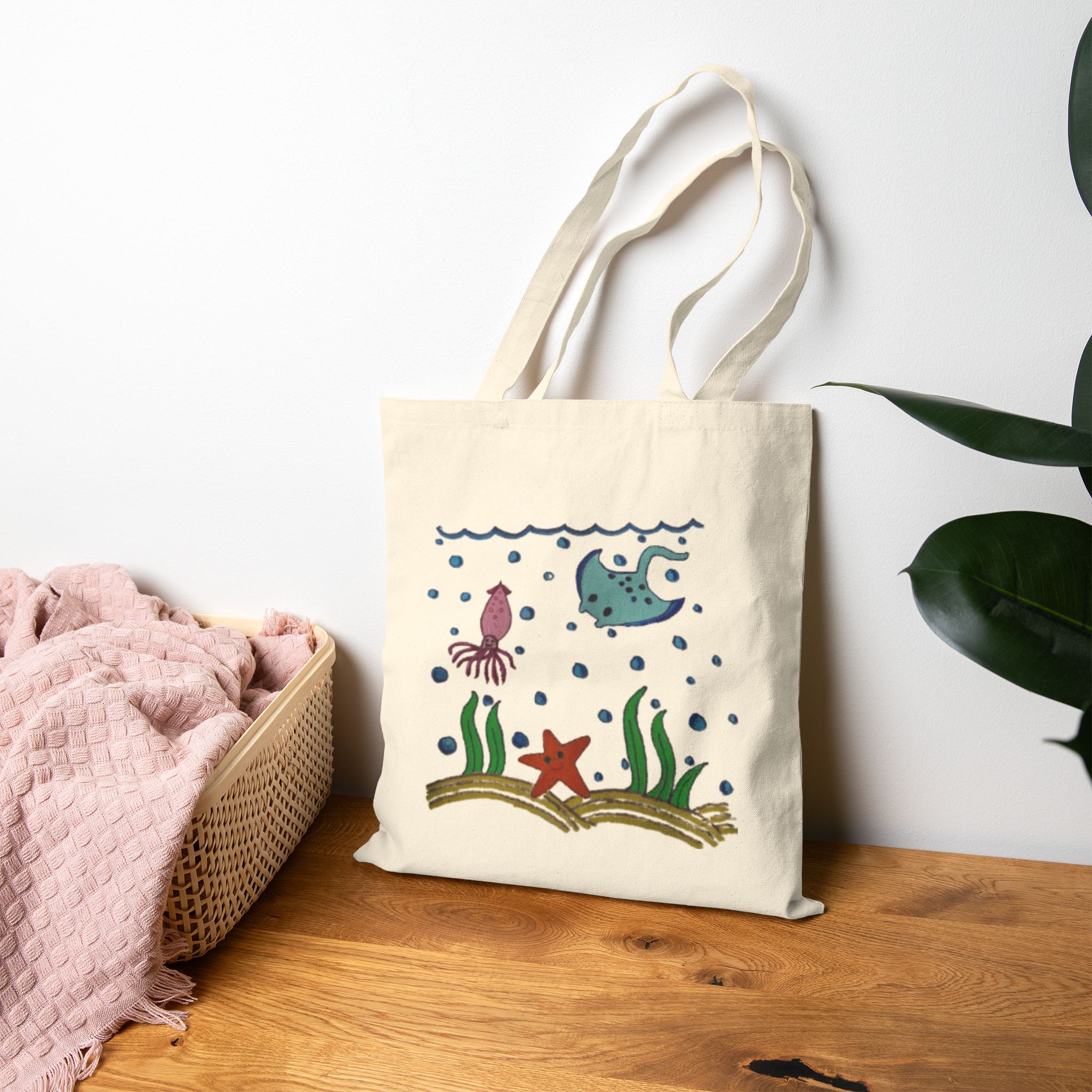 Adorable hand-painted marine life tote with starfish, squid, and ray motifs. Fun, artistic, and perfect for eco-conscious buyers.