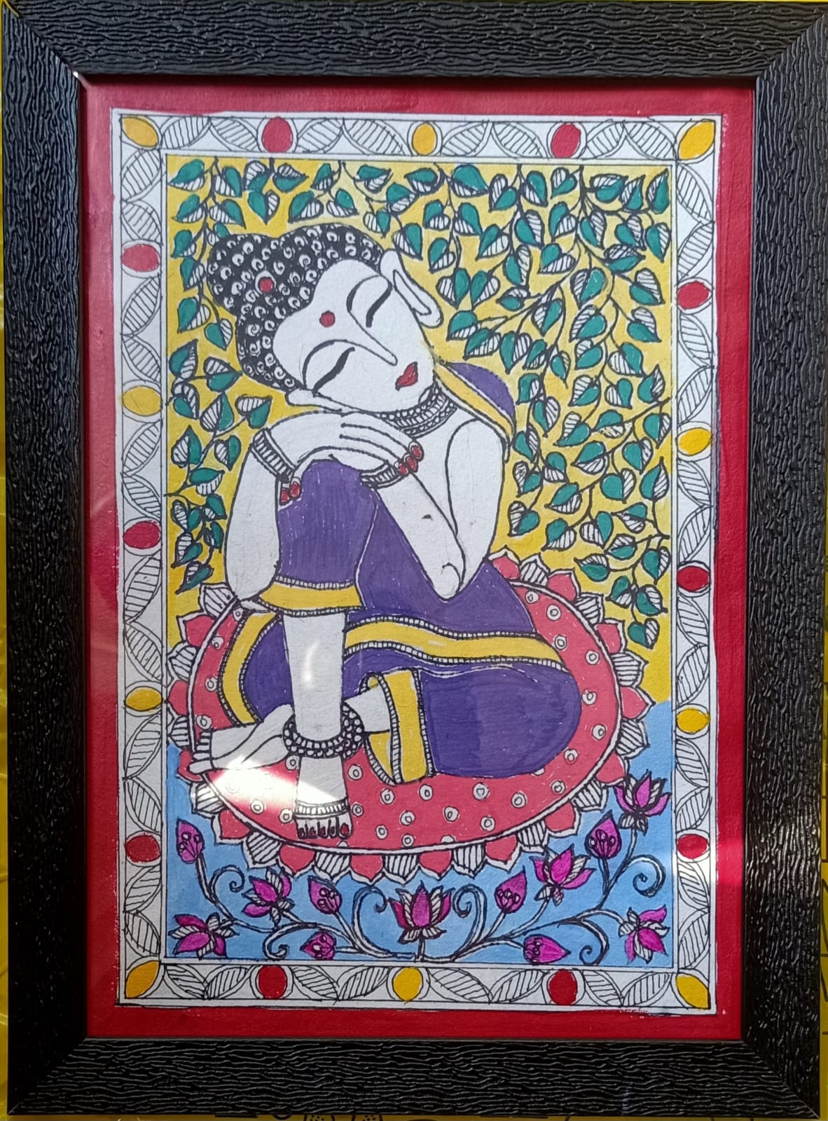 Embrace peace and mindfulness with this exquisite Madhubani-style Lord Buddha painting, thoughtfully crafted in traditional motifs and soothing earthy tones. The fine detailing symbolizes calmness, balance, and spiritual awakening. Framed in an elegant A4-size border, it’s perfect for meditation corners, study rooms, or as a thoughtful gift bringing tranquility and artful charm to any space.